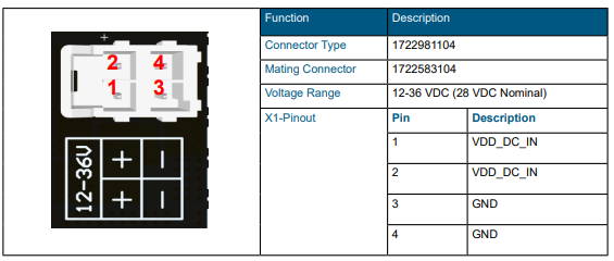 You can see the power connector pinout below. First and second pins are positive polarization, third and fourth pins are negative polarization.
